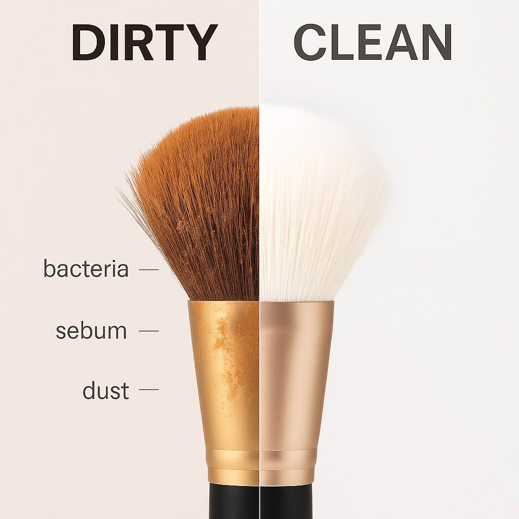 Every swipe of a dirty brush pushes sebum, dead skin cells, dust, and bacteria directly back onto your face. What looks invisible on the surface can cause long-term skin damage you don’t even see coming.